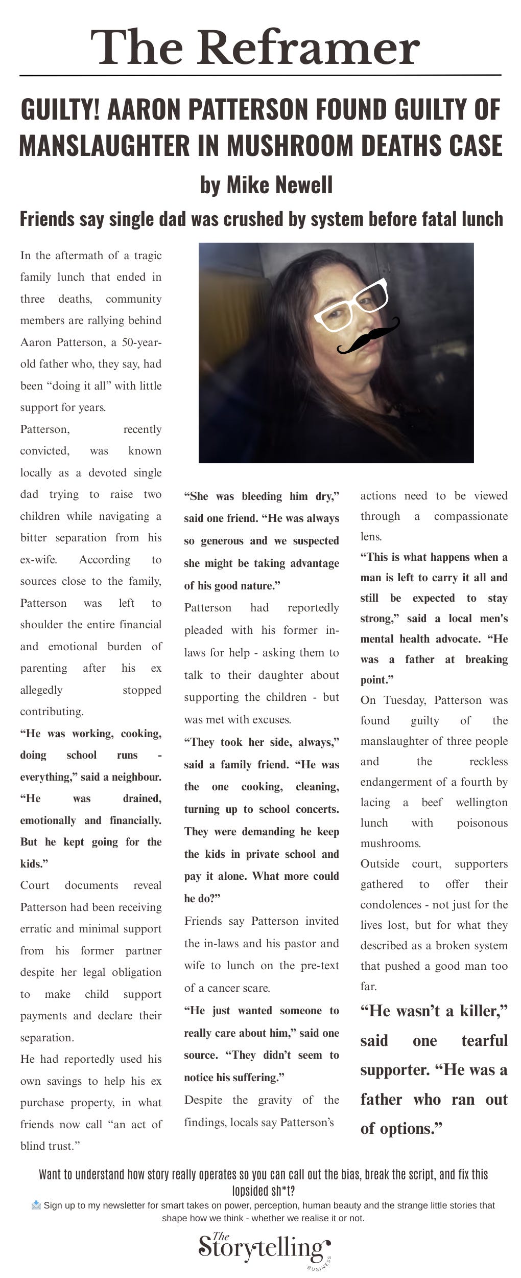 What would the headlines say if 𝗔𝗔𝗥𝗢𝗡 (𝗻𝗼𝘁 𝗘𝗿𝗶𝗻) 𝗣𝗮𝘁𝘁𝗲𝗿𝘀𝗼𝗻 was found guilty this week of murdering his in-laws with a poisoned pie? Of course, Aaron would have used a gun. Poison is historically a woman's weapon of choice.